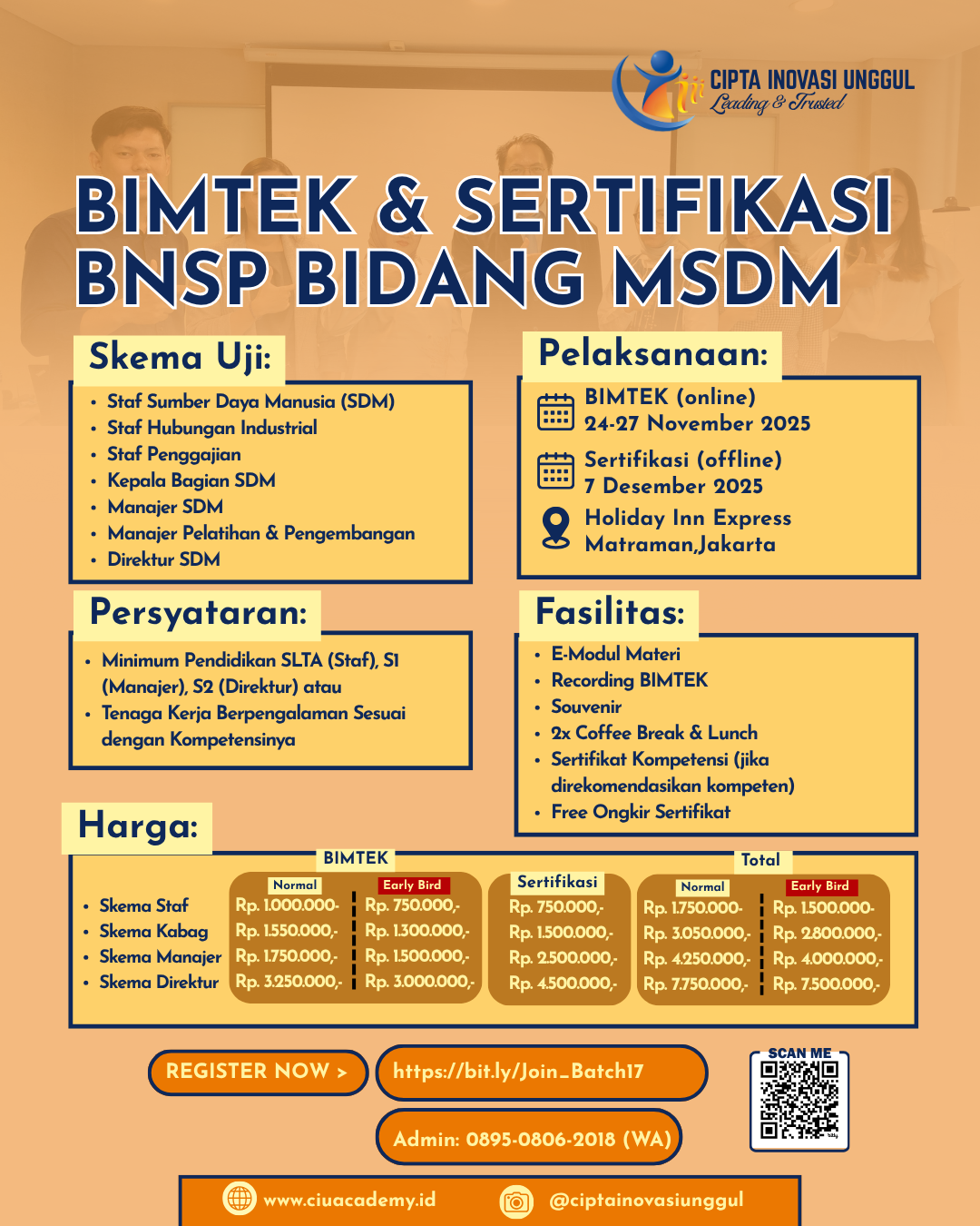 Profesionalisme di bidang Sumber Daya Manusia (SDM) kini menuntut bukti kompetensi yang terstandar. Untuk menjawab tantangan ini, LPK Cipta Inovasi Unggul dengan bangga mempersembahkan Bimbingan Teknis (Bimtek) & Sertifikasi BNSP Bidang MSDM (Batch 17).